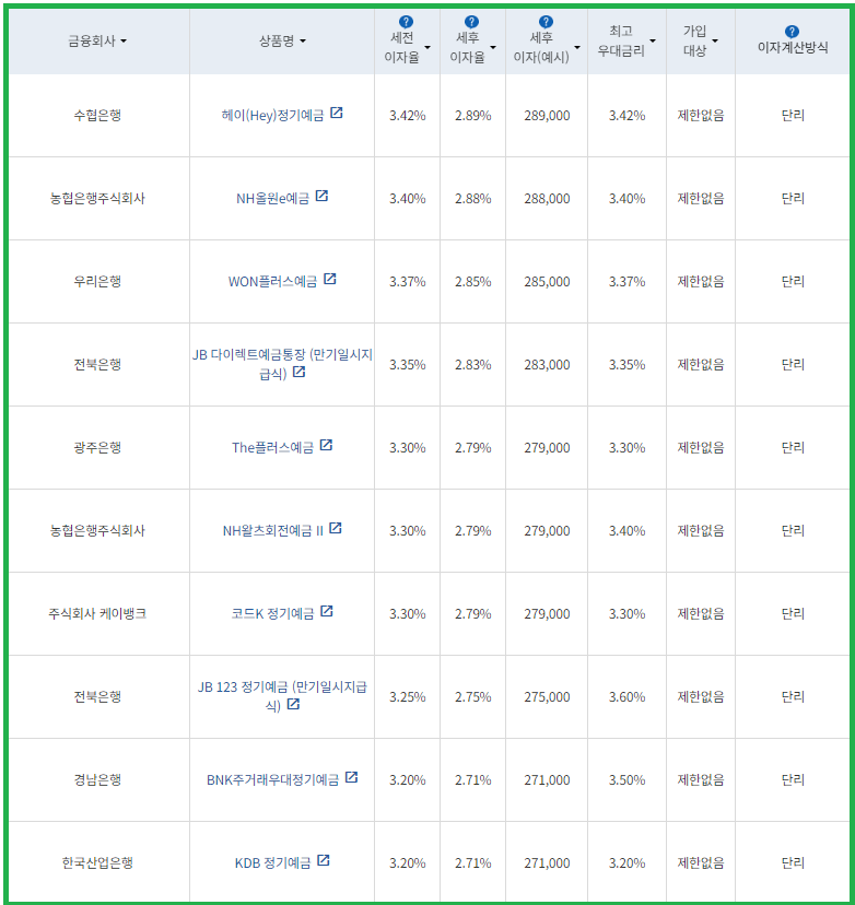| 비대면 | [수협은행] 헤이(Hey)정기예금 [전북은행] 1. JB 다이렉트예금통장 2. JB 123 정기예금 [우리은행] WON플러스예금 [주식회사 케이뱅크] *코드K 정기예금 [주식회사 카카오뱅크] 카카오뱅크 정기예금 [농협은행주식회사] NH올원e예금 [SC제일은행] e-그린세이브예금 [경남은행] 1. BNK주거래우대 정기예금 2. BNK더조은정기예금 [광주은행] 스마트모아Dream정기예금 [아이엠뱅크] IM스마트예금 [부산은행] 더(The) 레벨업 정기예금 [신한은행] 쏠편한 정기예금 |