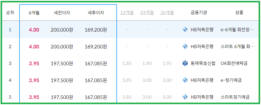 1~5위 저축은행과 신협이 차지하고 있는데요. 정기예금이 가장 높은 금융기관은 HB저축은행의 'e-6개월 회전정기예금'과 '스마트 6개월 회전정기예금' 상품이 있는데요.