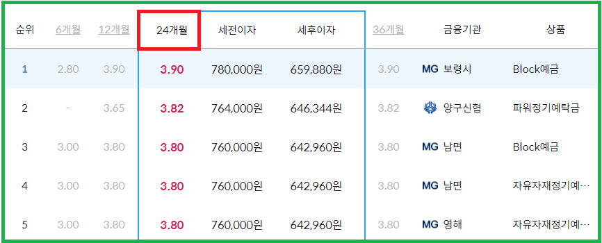 24개월 기준 보령시새마을금고 본점의 금리가 3.90%로 가장 높은데요. 상품명은 'Block예금'으로 24개월 만기 후 659,880원을 수령하시게 됩니다. 가입은 직접 창구에 방문하셔서 진행하셔야 하기 때문에 이 점 참고하시기 바랍니다.