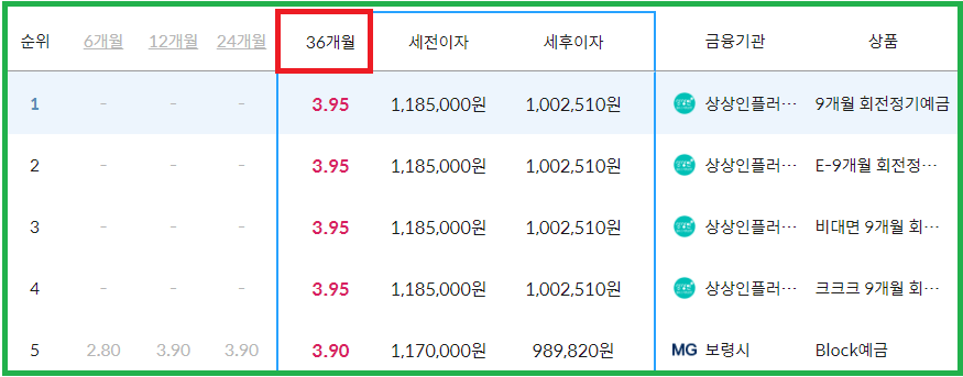 금리 3.90%의 보령시새마을금고 본점이 5위를 차지하고 있으며, 이 외 금융기관으로 상상인저축은행 본점의 '9개월 회전정기예금', '뱅뱅뱅 9개월 회전정기예금', 'e-9개월 회전정기예금', '비대면 9개월 회전정기예금' 상품이 있습니다.