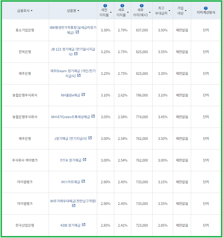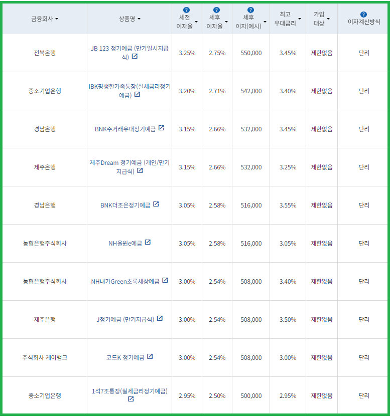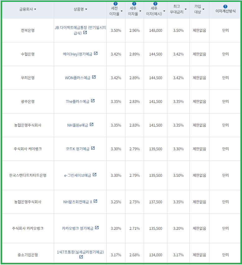 | 비대면 | [수협은행] 헤이(Hey)정기예금 [전북은행] 1. JB 다이렉트예금통장 2. JB 123 정기예금 [우리은행] WON플러스예금 [주식회사 케이뱅크] *코드K 정기예금 [주식회사 카카오뱅크] 카카오뱅크 정기예금 [농협은행주식회사] NH올원e예금 [SC제일은행] e-그린세이브예금 [경남은행] 1. BNK주거래우대 정기예금 2. BNK더조은정기예금 [광주은행] 스마트모아Dream정기예금 [아이엠뱅크] IM스마트예금 [부산은행] 더(The) 레벨업 정기예금 [신한은행] 쏠편한 정기예금 |
