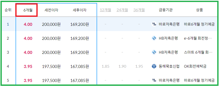 지난주와 비교했을 대 24개월 기준의 순위 및 상품, 금리 변동이 없었는데요. 6개월부터 살펴보겠습니다.