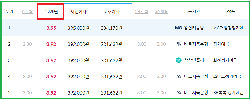12개월 상품으로 금리가 가장 높은 곳은 왕십리중앙새마을금고 본점인데요. 금리 3.95%로 상품명은 'MG더뱅킹정기예금(우대금리 0.3% 충족 시)'입니다.