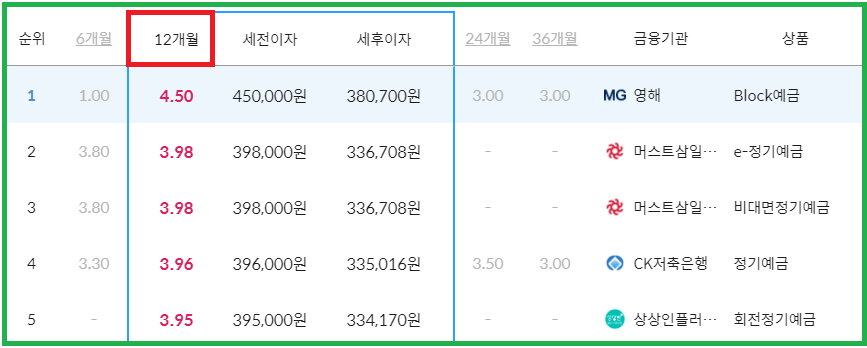 이 외 3~36개월에 대한 정기예금 상품에 대해 다음 목차에서 자세하게 다룰 예정이기 때문에 아래 표는 참고만 하시고 넘어가시면 되겠습니다.
