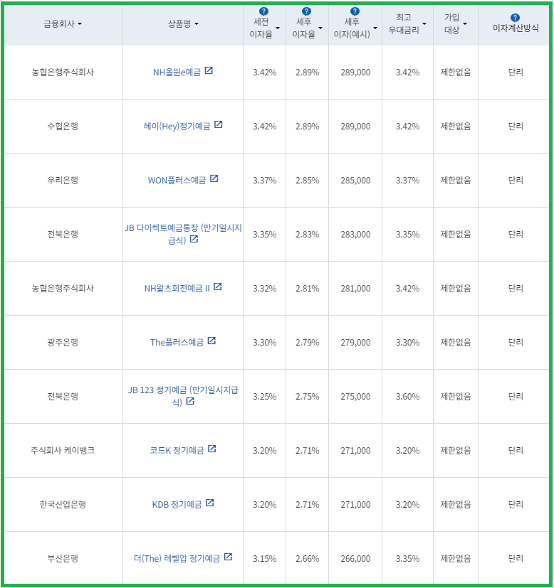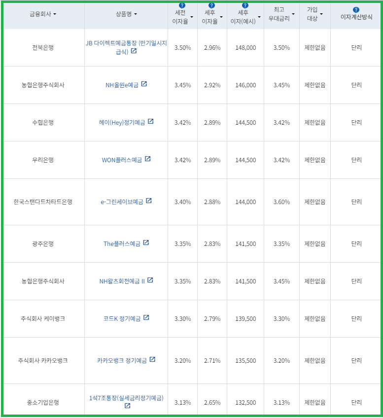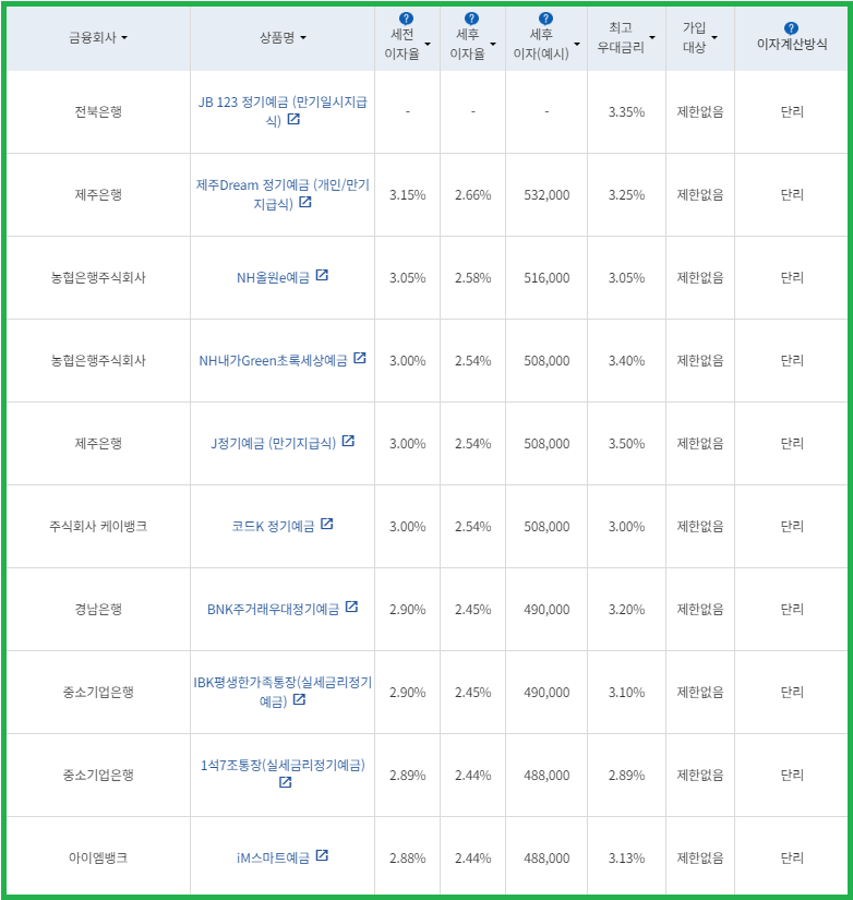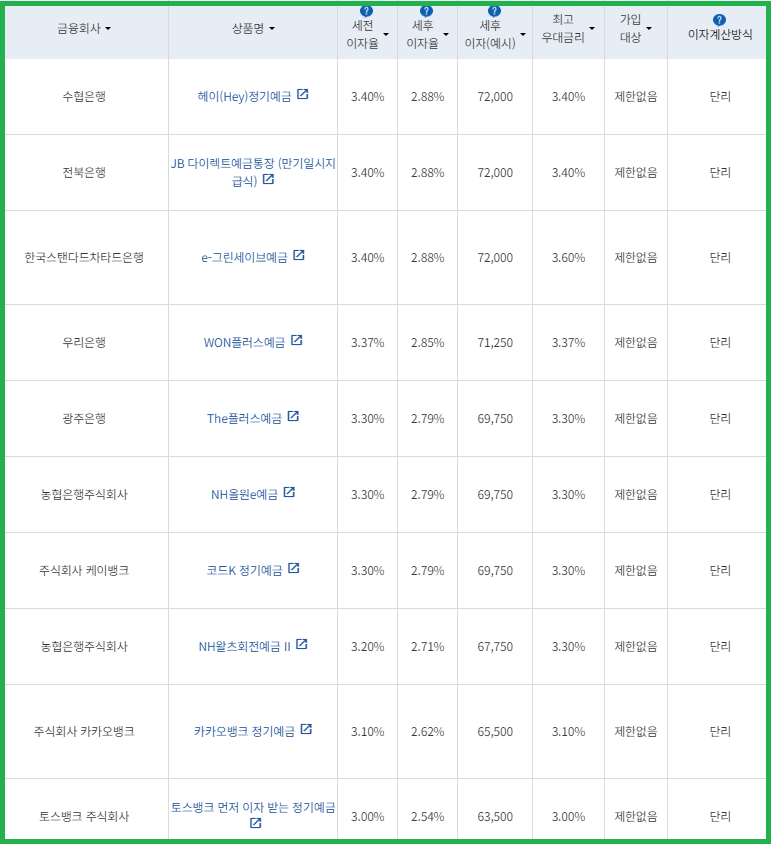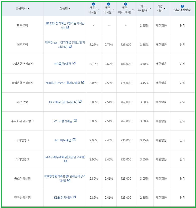| 비대면 | [수협은행] 헤이(Hey)정기예금 [전북은행] 1. JB 다이렉트 예금통장 2. JB 123 정기예금 [우리은행] WON플러스예금 [IBK 기업은행] 1석7조통장 [주식회사 케이뱅크] *코드K 정기예금 [주식회사 카카오뱅크] 카카오뱅크 정기예금 [농협은행주식회사] NH올원e예금 [SC제일은행] e-그린세이브예금 [경남은행] 1. BNK주거래우대 정기예금 2. BNK더조은정기예금 [광주은행] 스마트모아Dream 정기예금 [아이엠뱅크] IM스마트예금 [부산은행] 더(The) 레벨업 정기예금 [신한은행] 쏠편한 정기예금 [토스뱅크 주식회사] *토스뱅크 먼저 이자 받는 정기예금 |