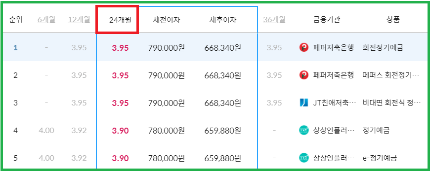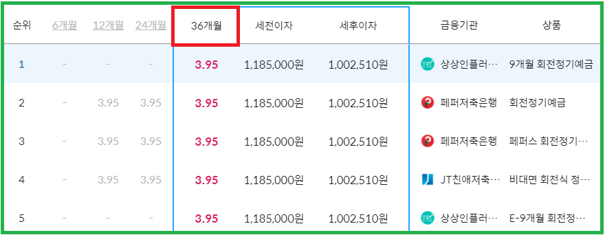 마지막으로 36개월 동안 예금 하실 경우 금리가 가장 높은 곳은 1~5위 모두 금리 3.95%에 해당합니다.