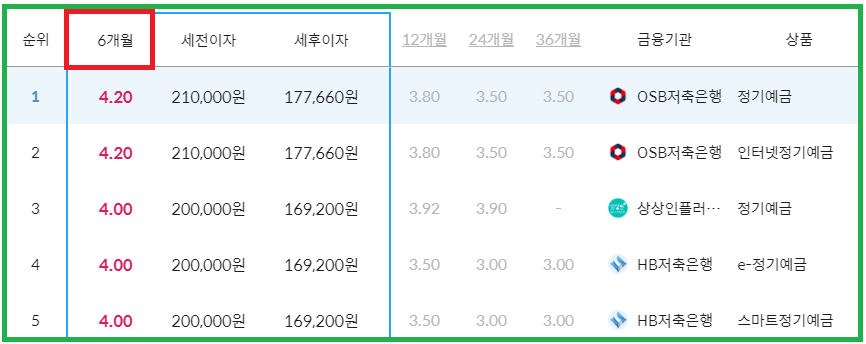 예금 기간 6개월일 경우 금리가 가장 높은 곳은 금리 4.20%로 OSB저축은행이 되겠습니다.