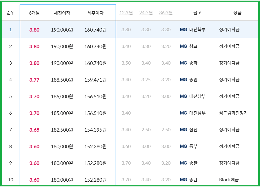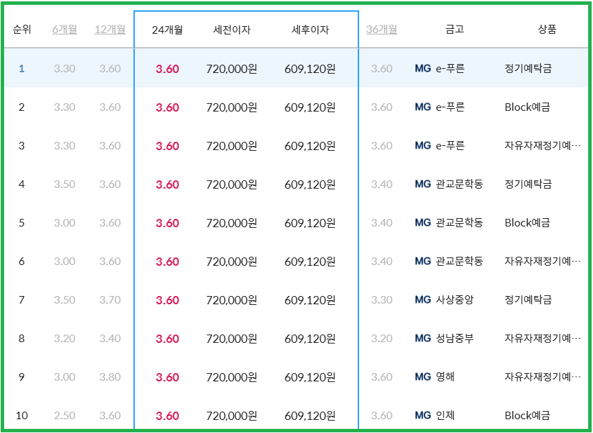 2위 늘푸른사상 새마을금고 본점(MG더뱅킹정기예금)과 8위 나주동부 새마을금고 본점(MG더뱅킹정기예금), 9위 검단 새마을금고 본점(행정안전부장관 표창 수상 기념 특판, MG더뱅킹정기예금)은 온라인으로 가입 가능합니다.