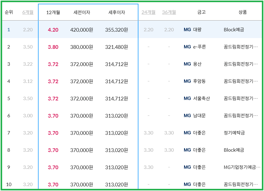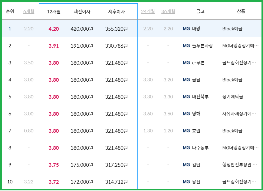 금리가 가장 높은 곳은 대왕 새마을금고 본점으로 금리 4.20%에 해당합니다. 상품명은 'Block예금'이며, 12개월 만기 후 355,320원을 수령하시게 됩니다. 가입 방법은 창구에 직접 방문하셔서 진행하셔야 합니다.