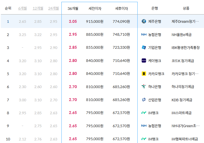 제주은행의 '제주Dream정기예금' 상품이 금리 3.05%로 가장 높으며, 만기 후 774,090원을 수령하시게 됩니다.