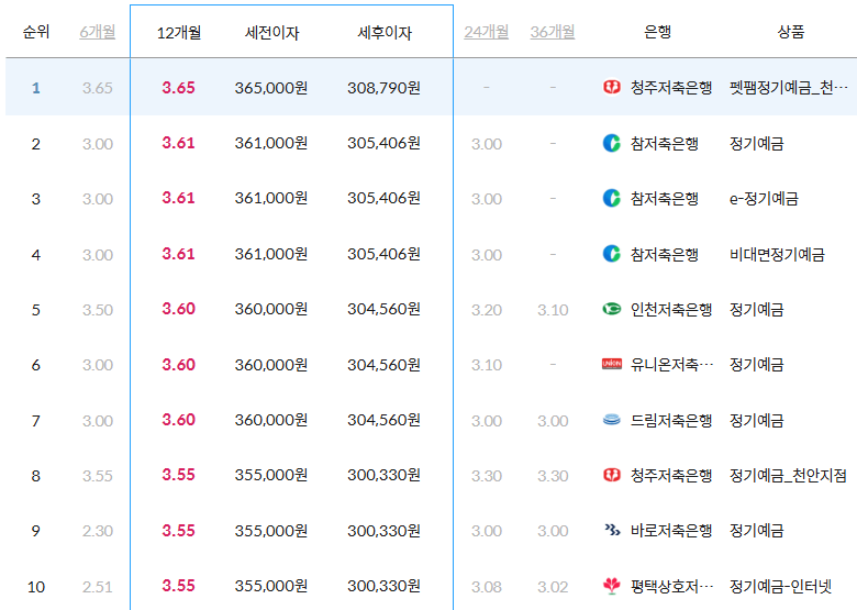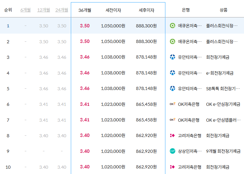 6개월부터 36개월에 이르는 예치 기간을 기준으로 1,000만 원 예치했을 경우에 한하여 1~10위 순위로 정리했으니 이점 참고해 주시기 바랍니다.