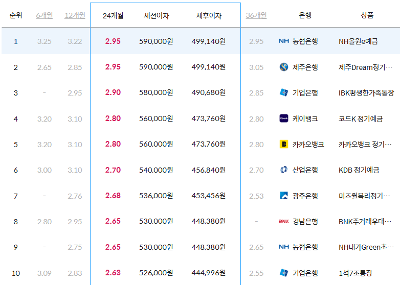 금리 2.95%의 NH농협은행과 제주은행입니다.