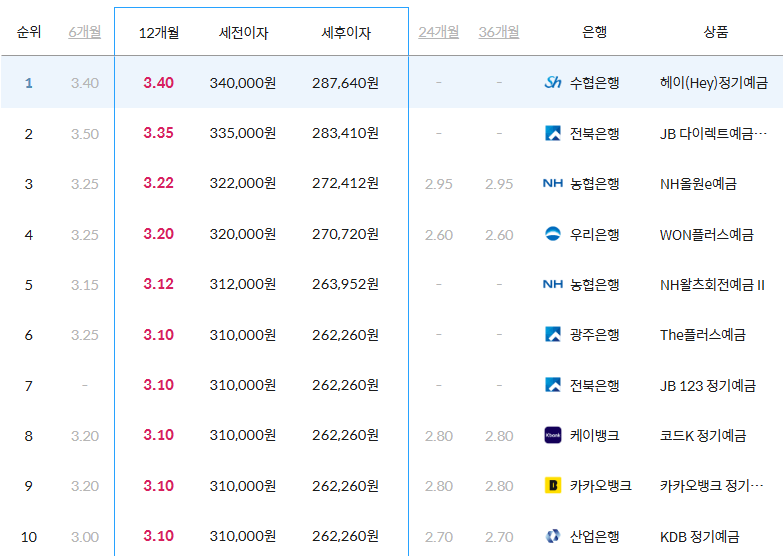 12개월 기준 금리가 가장 높은 시중은행으로 금리 3.40%로 수협은행의 '헤이(Hey)정기예금' 상품이 가장 높습니다.