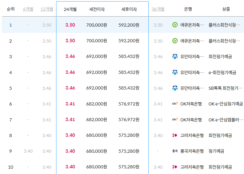특히 6~36개월에 해당하는 정기예금 상품 및 금융기관 중 1~10위권에는 6개월 상품에 유일하게 저축은행이 있다는 점이 특징입니다.