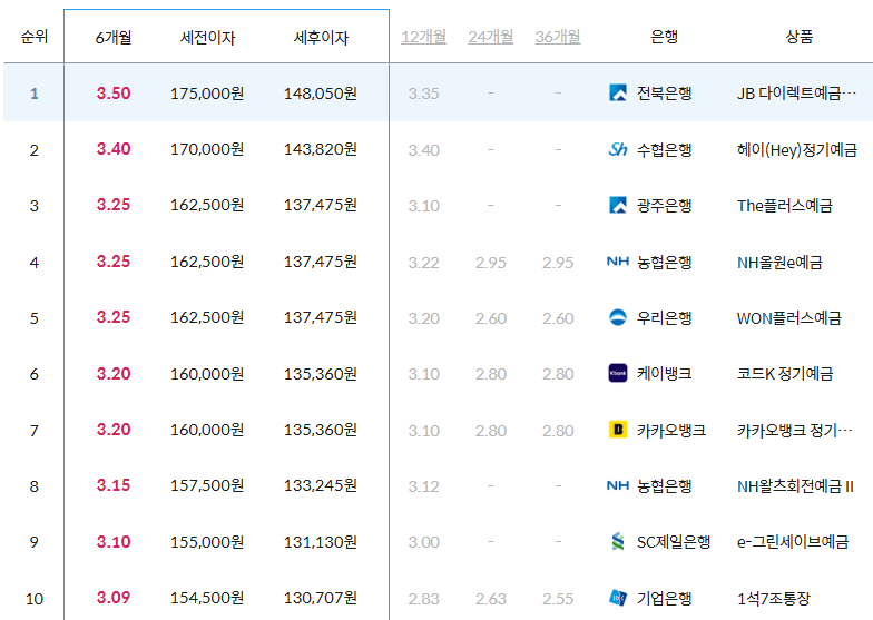 이와 반대로 시중은행의 금리가 가장 높은 곳은 6개월 상품의 전북은행(JB 다이렉트예금통장, 3.50%)입니다.