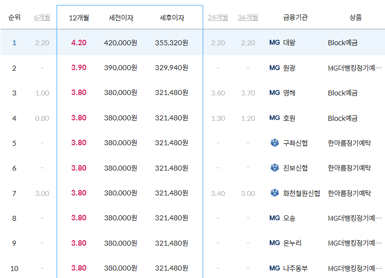 1. 12개월(원광 새마을금고 본점, MG더뱅킹정기예금, 3.90%)