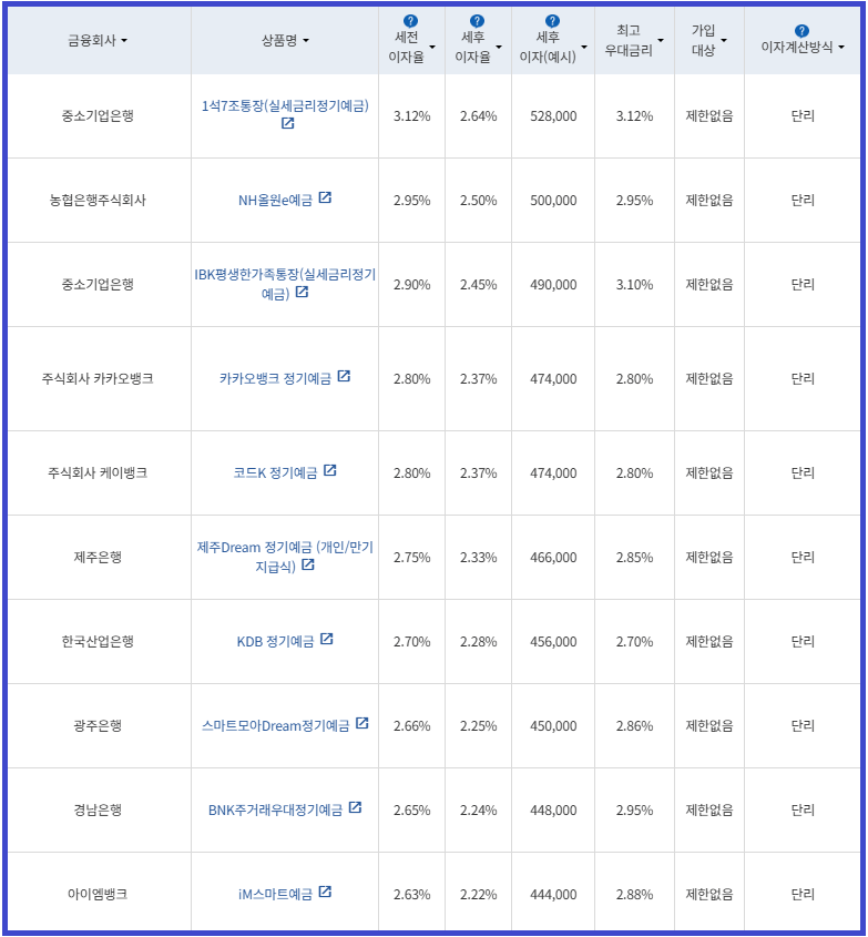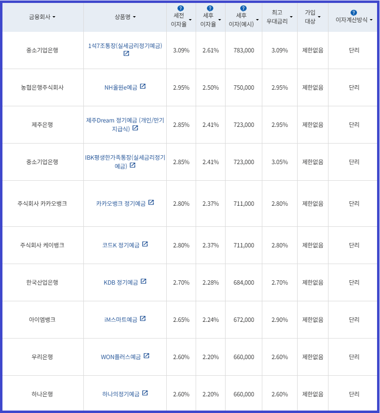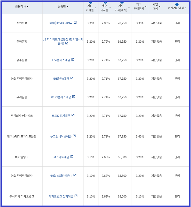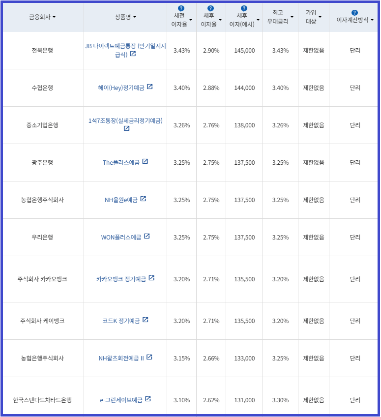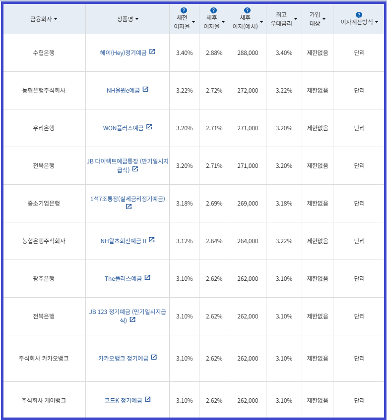 | 비대면 | [수협은행] 헤이(Hey)정기예금 [전북은행] 1. JB 다이렉트 예금통장 2. JB 123 정기예금 [우리은행] WON플러스예금 [IBK 기업은행] 1석7조통장 [주식회사 케이뱅크] *코드K 정기예금 [주식회사 카카오뱅크] 카카오뱅크 정기예금 [농협은행주식회사] NH올원e예금 [SC제일은행] e-그린세이브예금 [경남은행] 1. BNK주거래우대 정기예금 2. BNK더조은정기예금 [광주은행] 스마트모아Dream 정기예금 [아이엠뱅크] IM스마트예금 [부산은행] 더(The) 레벨업 정기예금 [신한은행] 쏠편한 정기예금 [하나은행] 하나의정기예금 [토스뱅크 주식회사] *토스뱅크 먼저 이자 받는 정기예금 |