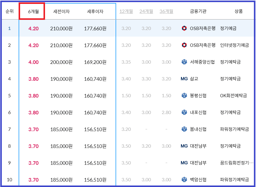 가입율은 12개월 상품이 높지만 아래 6개월 상품에 대한 금리표를 여러분께 알려드리는 이유는 바로 금리입니다.