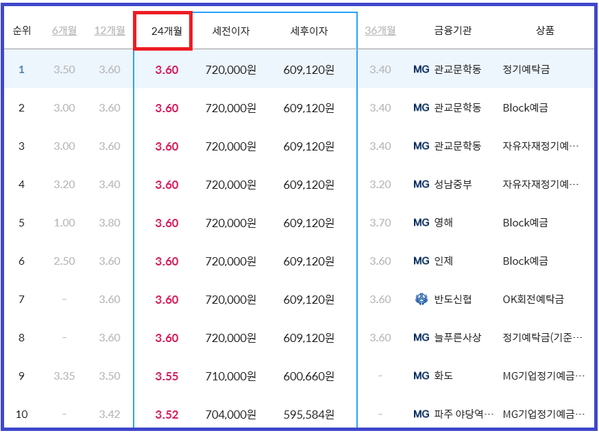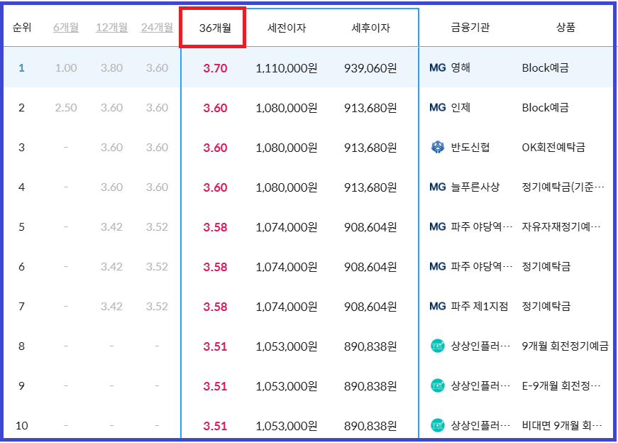 조사 기준은 예치 기간: 6~36개월, 예치 금액: 1천만 원, 순위: 1~10위에 한해 정리했으니 참고하시기 바랍니다.